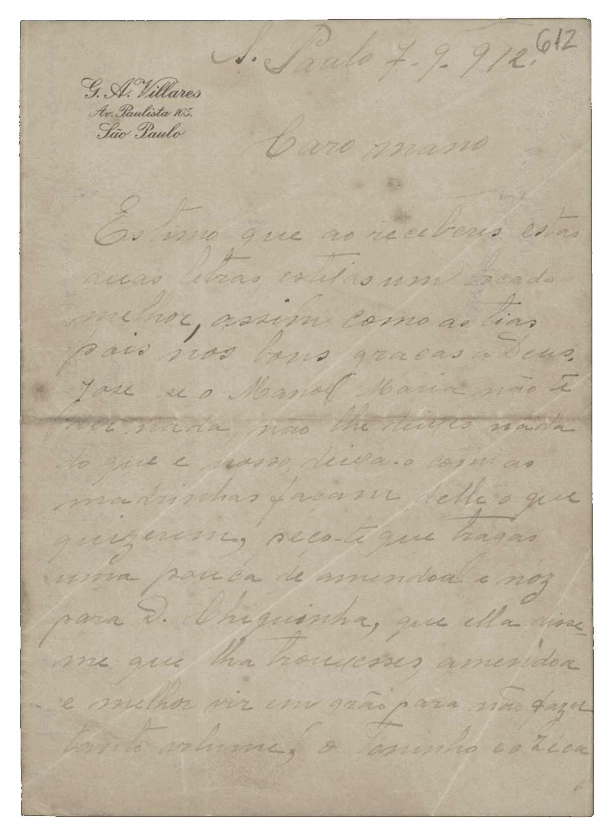 A sua última carta trouxe-me alento. Vivo sempre na expectativa de notícias de Portugal e, principalmente, suas. Desejo que me seja possível receber do senhor as mais longas e satisfatórias informações, para não viver um tanto sobressaltada por estar tão longe.