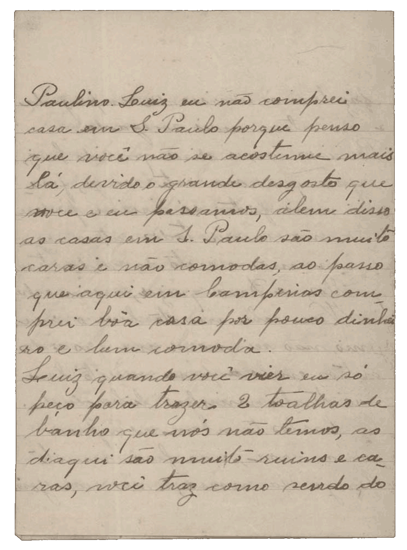Aqui estou vivendo com os maiores amigos. Mesmo assim tenho que andar debaixo do pé deles, porque é triste quem aqui não tem ninguém. Custa-me muito aguentar a saudade da senhora, assim como a senhora deve sentir o mesmo por mim, porque é minha mãe. Se me tem alguma amizade, venha sem demora.