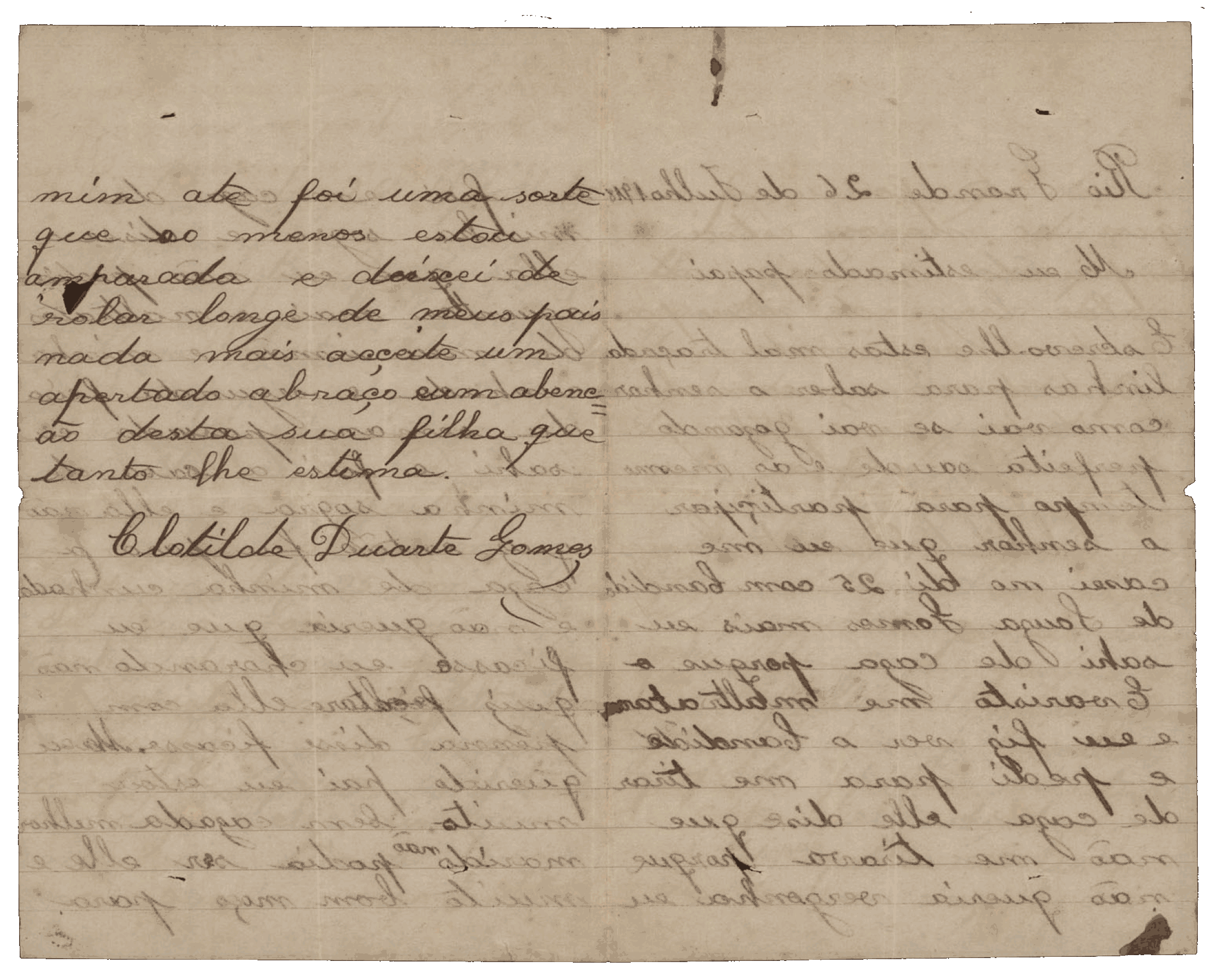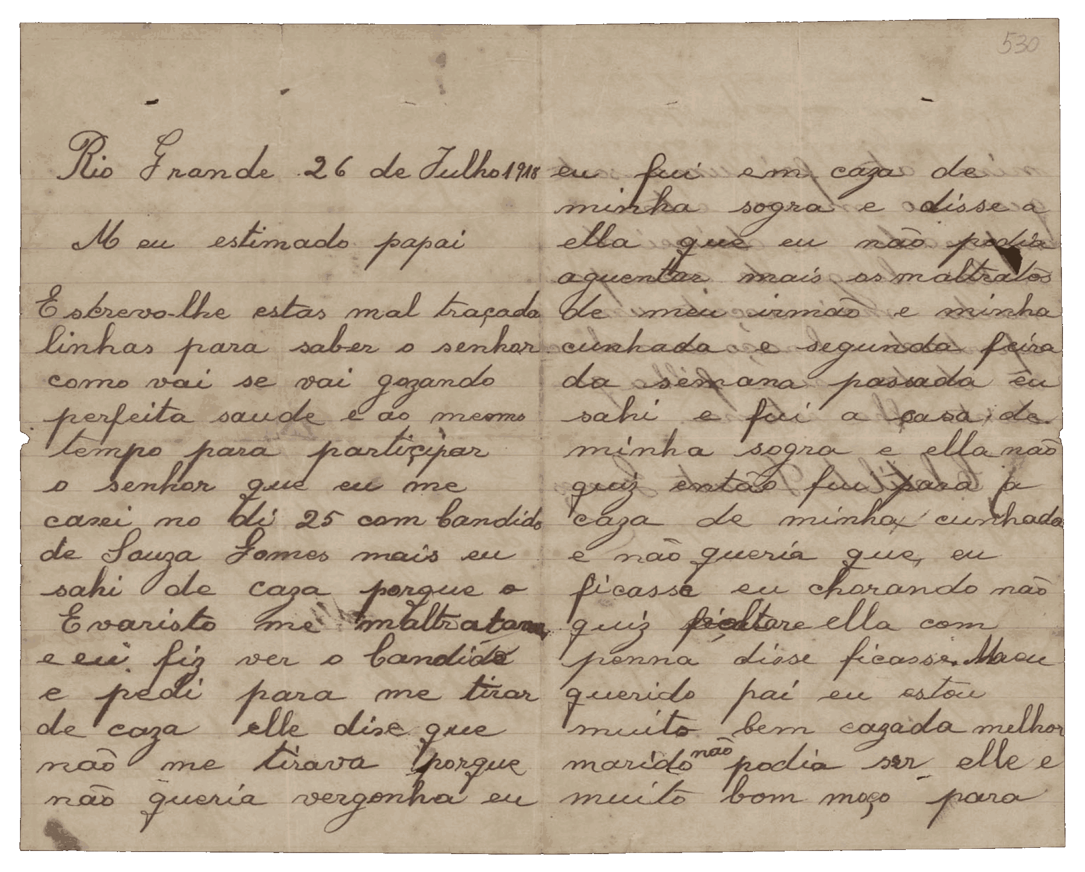 Meu querido pai, quero lhe contar que me casei no dia vinte e cinco com o Cândido de Souza Gomes. Melhor marido não podia ser. Ele é muito bom moço para mim. Até foi uma sorte, porque agora estou amparada e deixei de andar desamparada longe de meus pais.