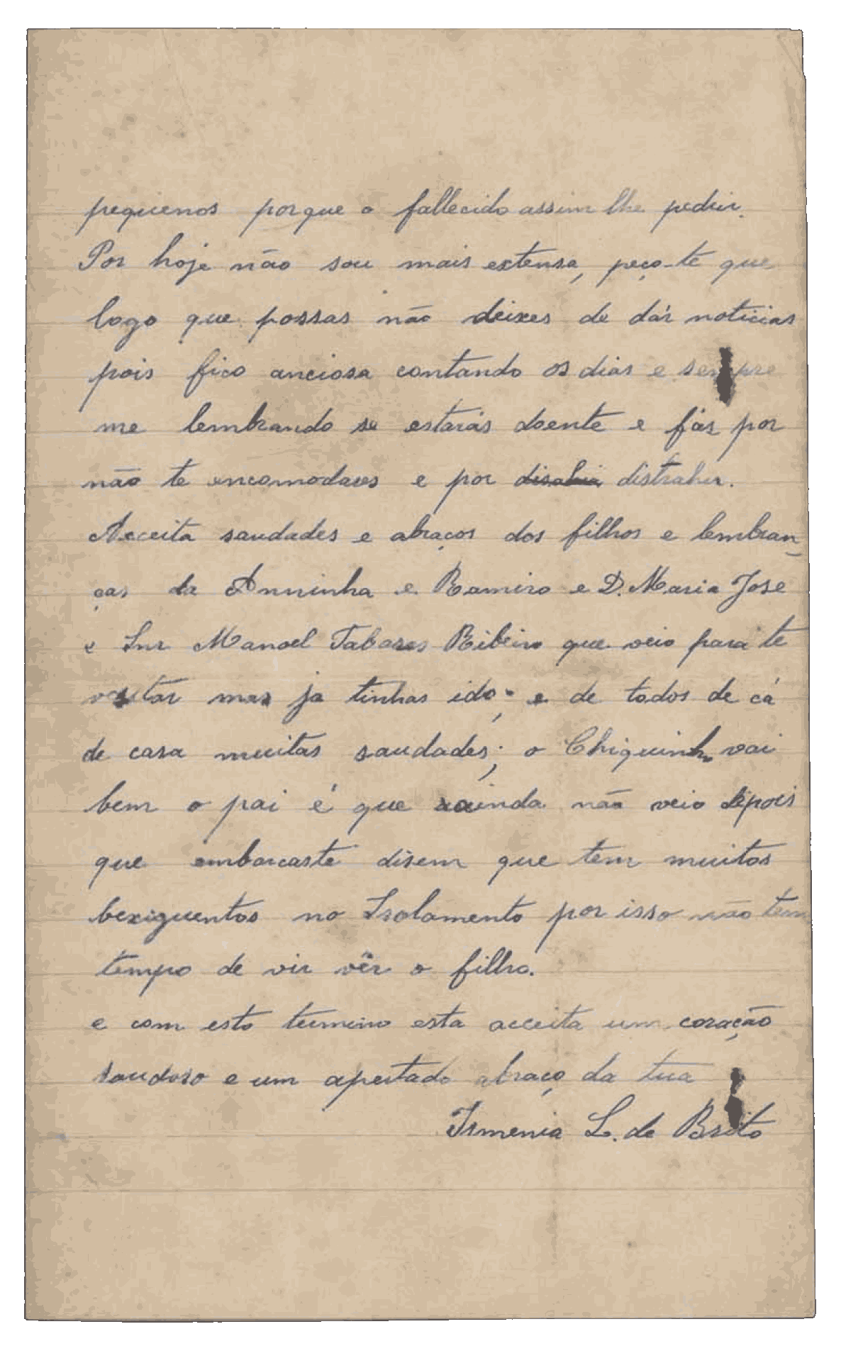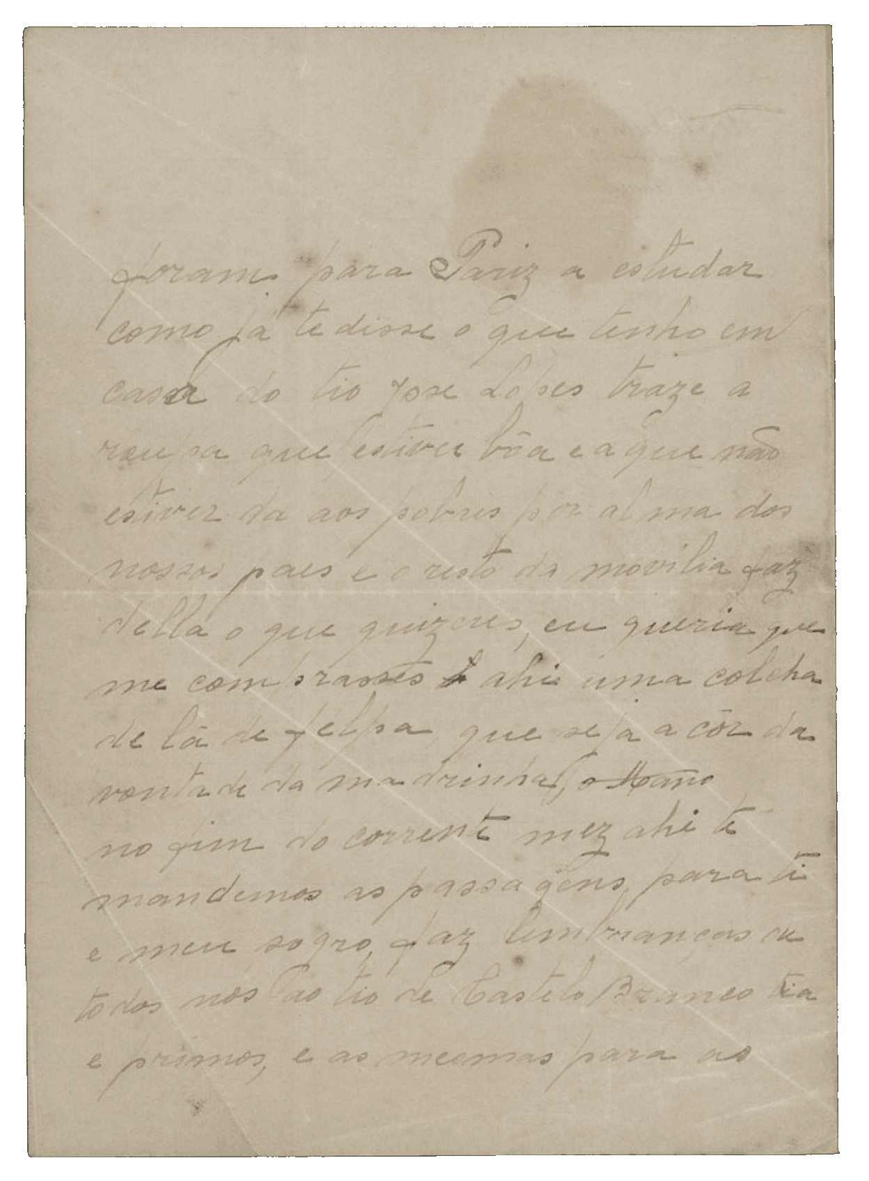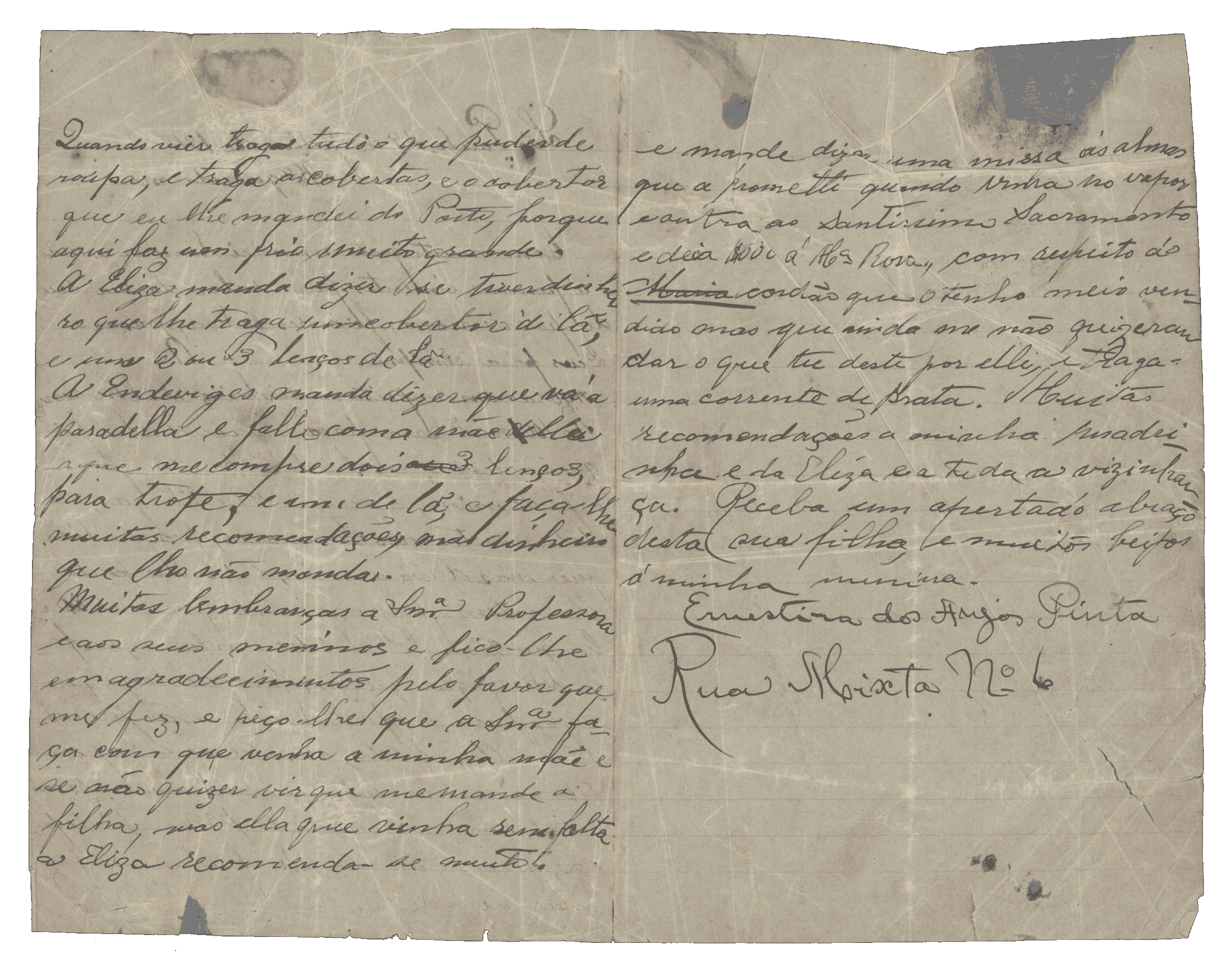 Do que tenho em casa do tio José Lopes, traz a roupa que estiver boa. A que não estiver, dá aos pobres por alma dos nossos pais. Eu queria que me comprasses aí uma colcha de lã de felpa, da cor que a madrinha preferir. Mano, no fim deste mês aqui te mandaremos as passagens para ti e para o meu sogro.