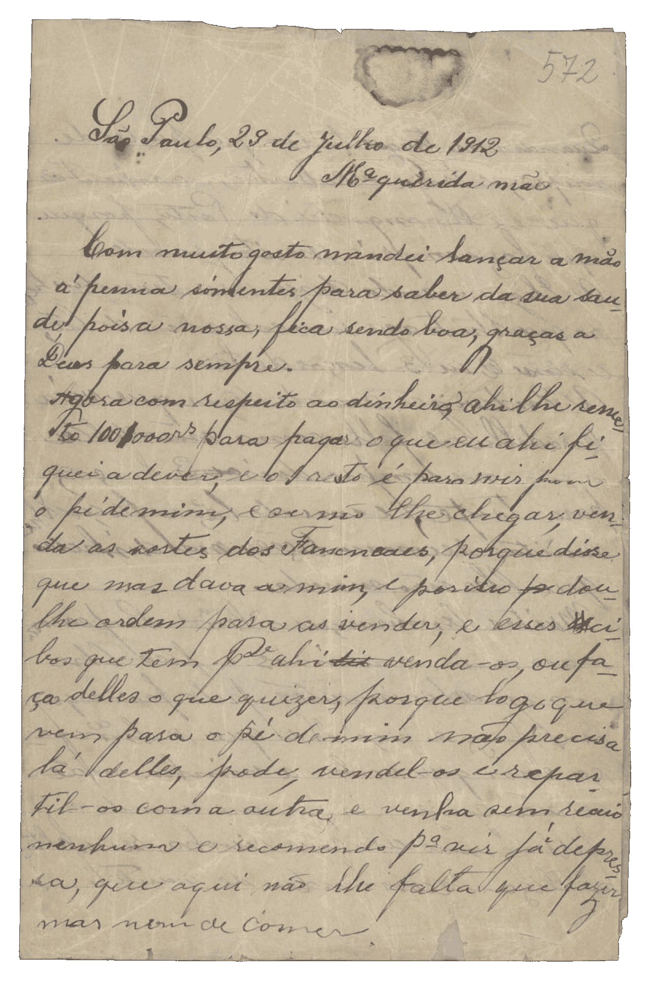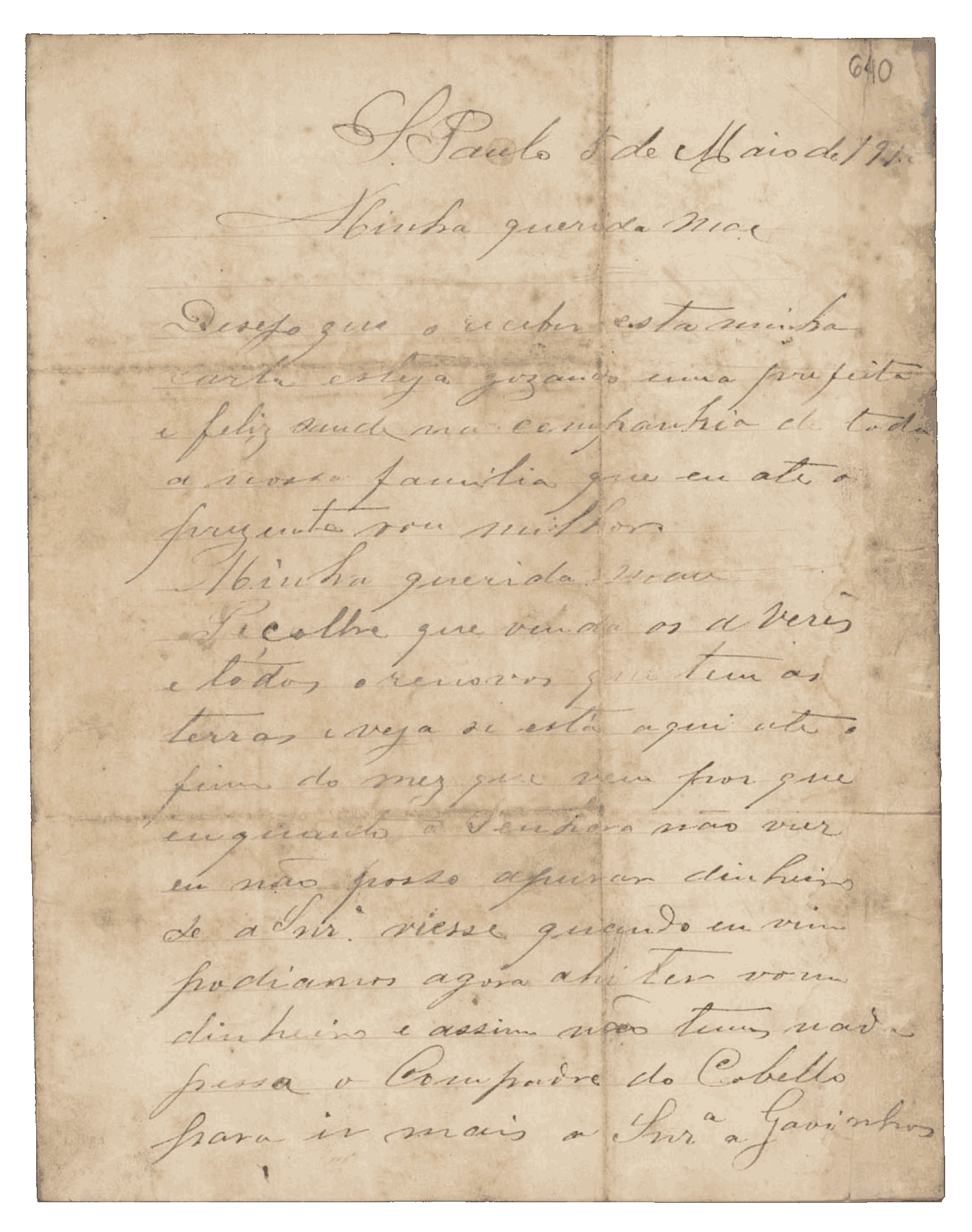 Minha querida mãe, Essas coisas que tem por aí, venda-as ou faça delas o que quiser, porque logo que vier para o pé de mim já não precisa delas. Venha sem receio nenhum — e venha já depressa, porque aqui não lhe falta que fazer, nem de comer.