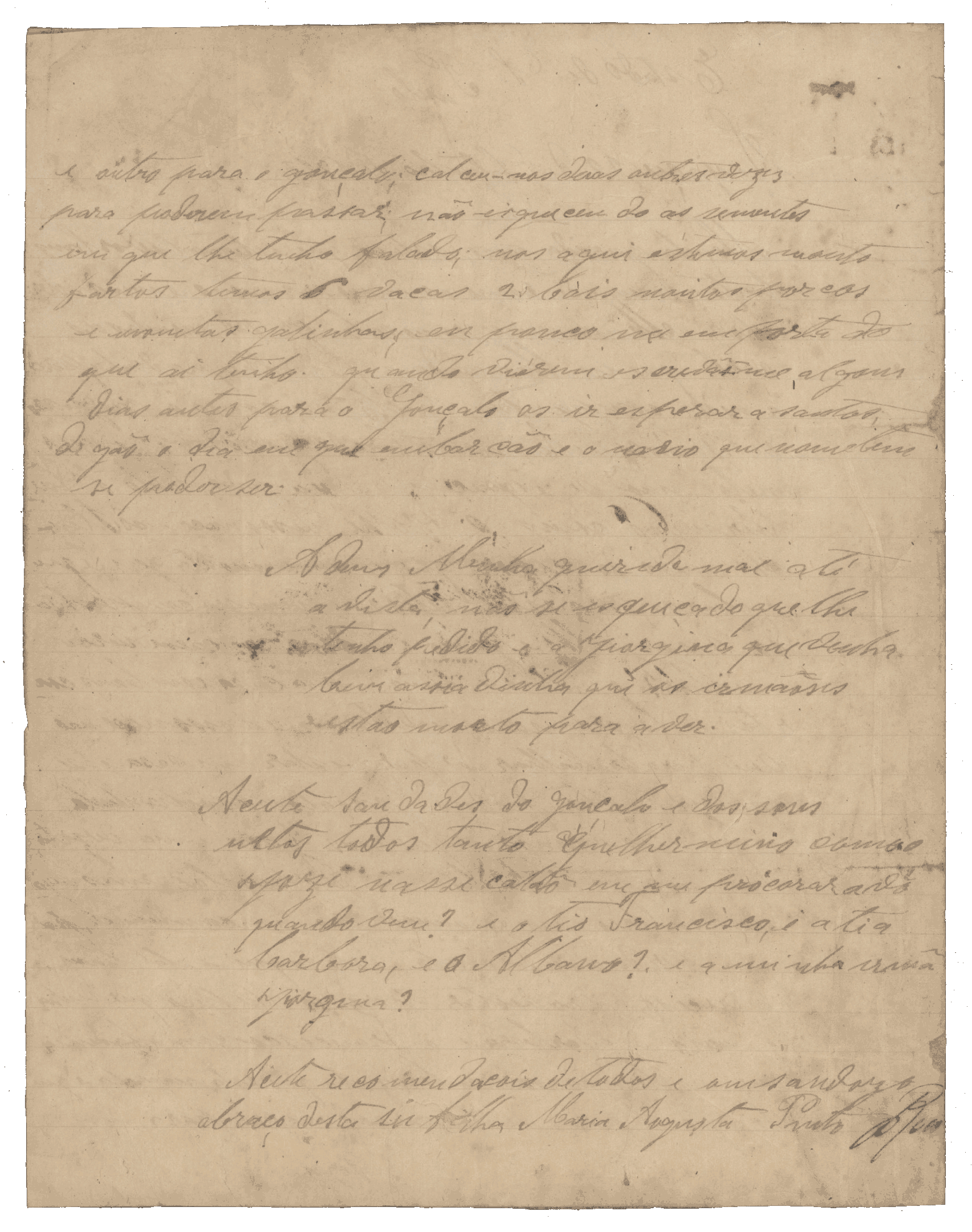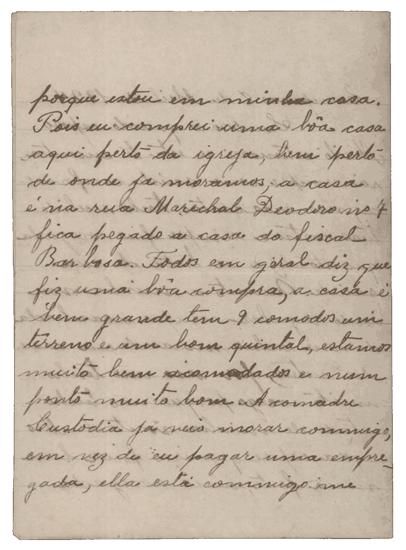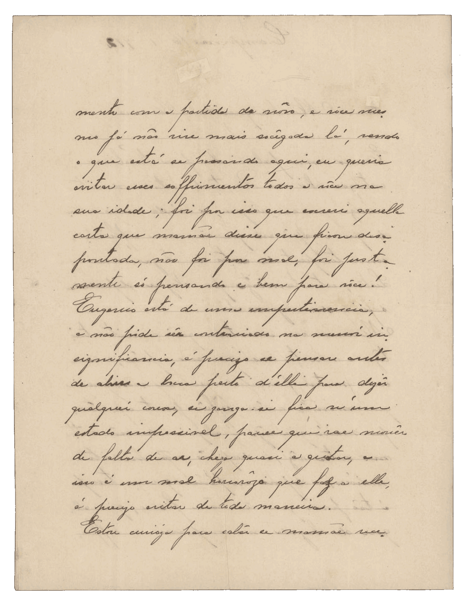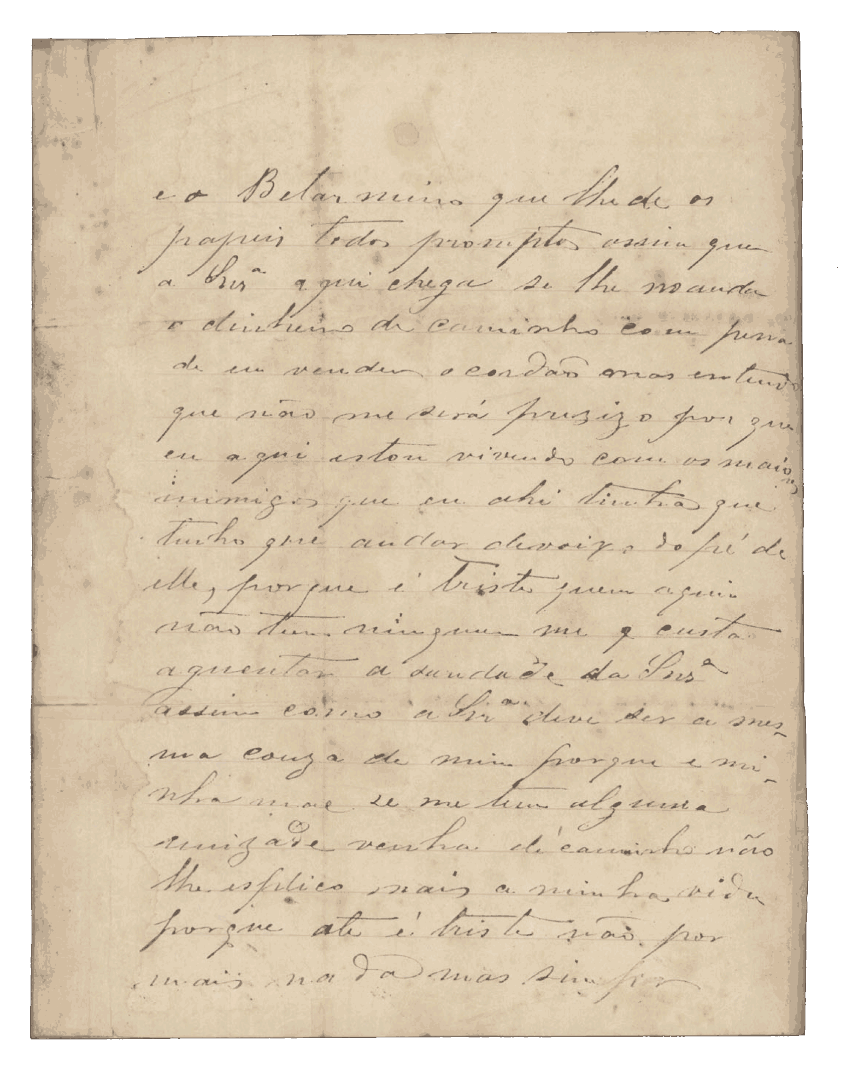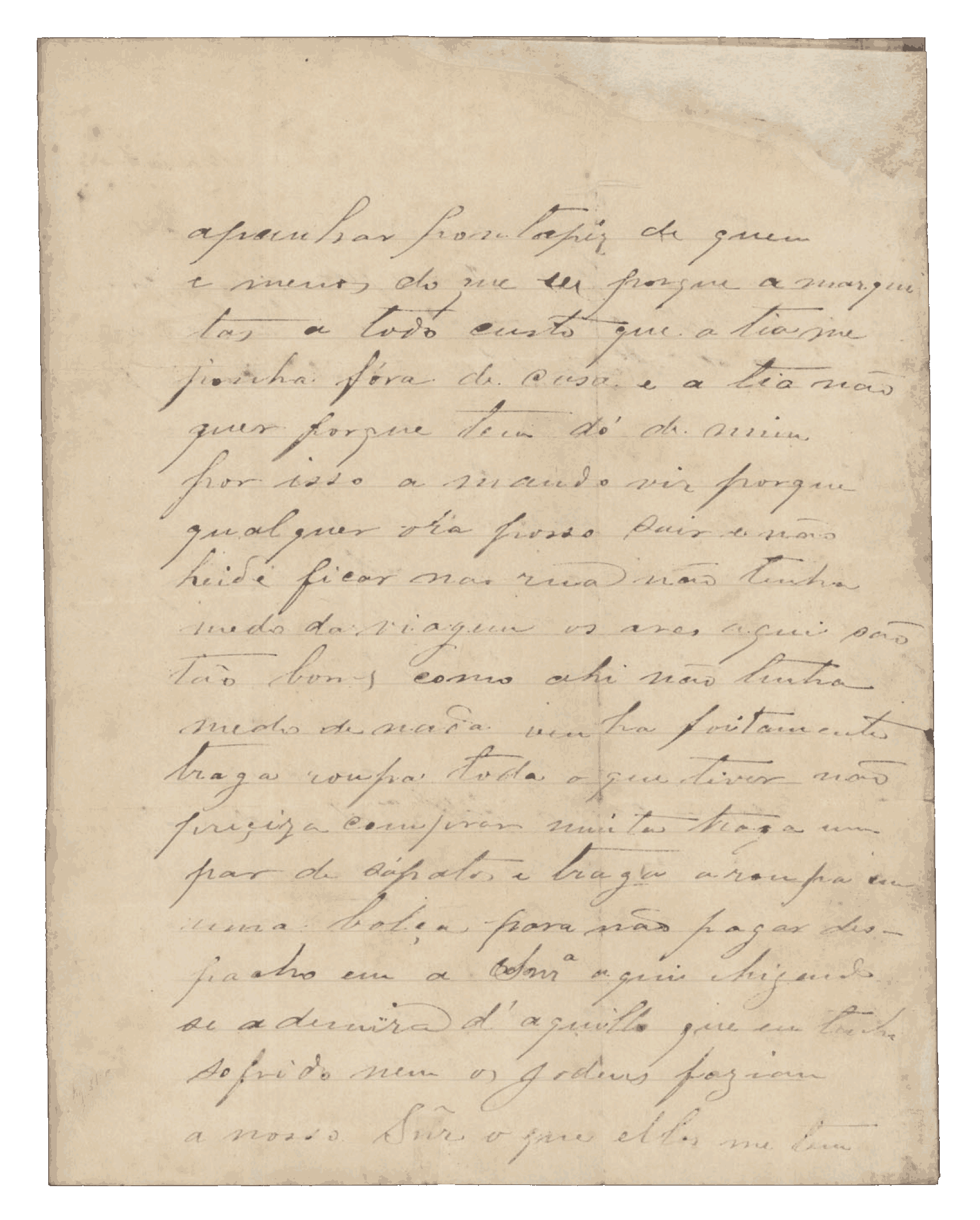 Aqui estou vivendo com os maiores amigos. Mesmo assim tenho que andar debaixo do pé deles, porque é triste quem aqui não tem ninguém. Custa-me muito aguentar a saudade da senhora, assim como a senhora deve sentir o mesmo por mim, porque é minha mãe. Se me tem alguma amizade, venha sem demora.