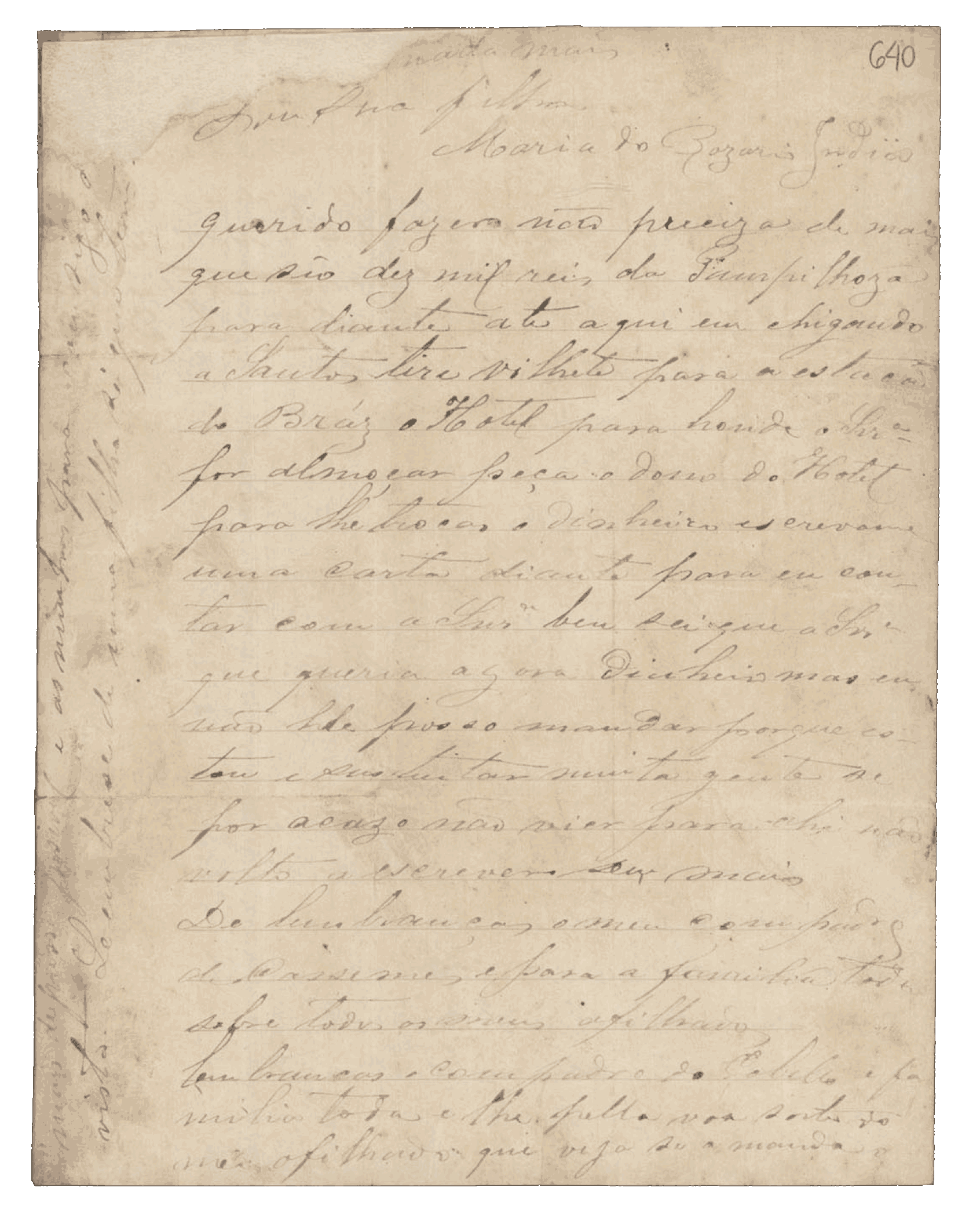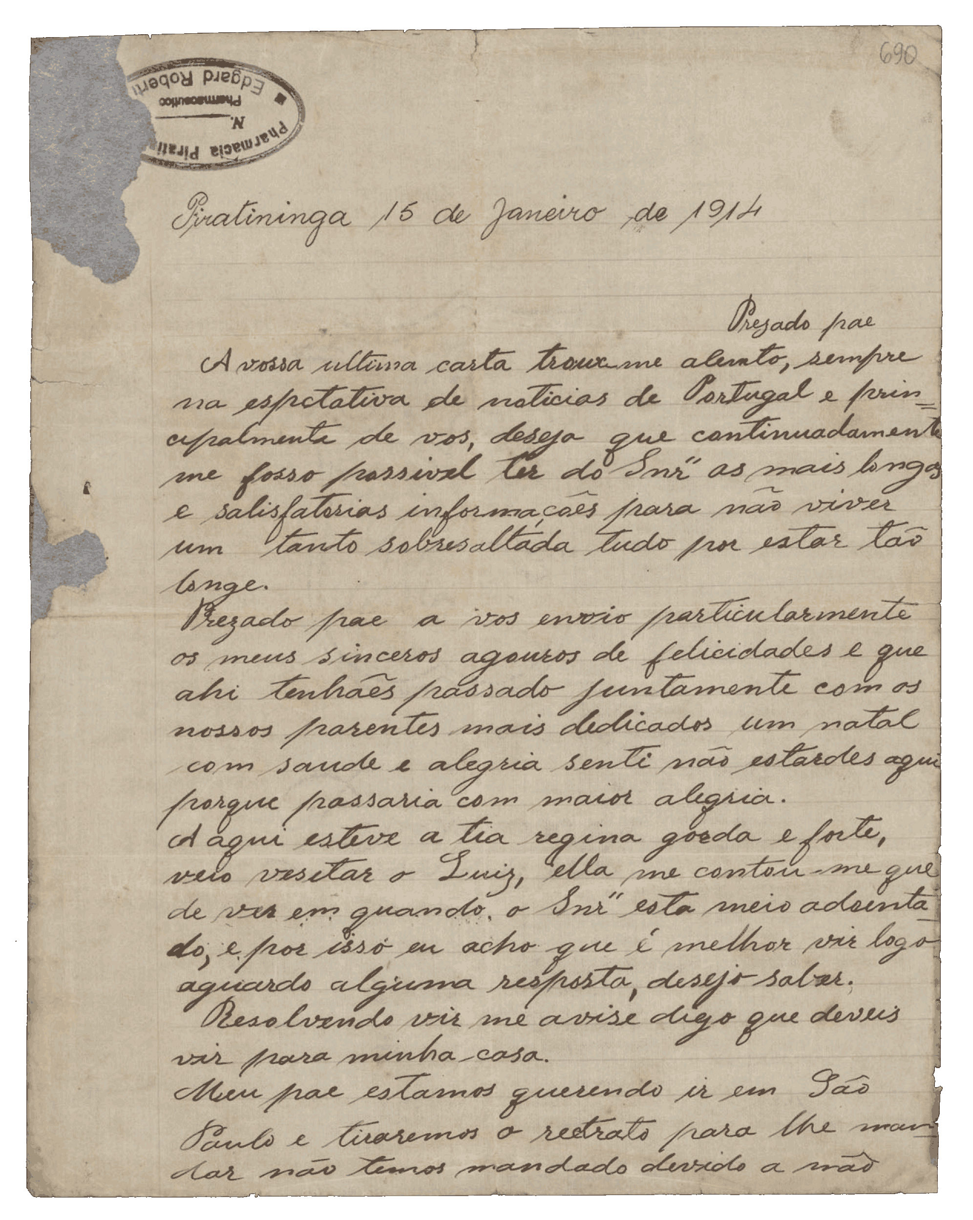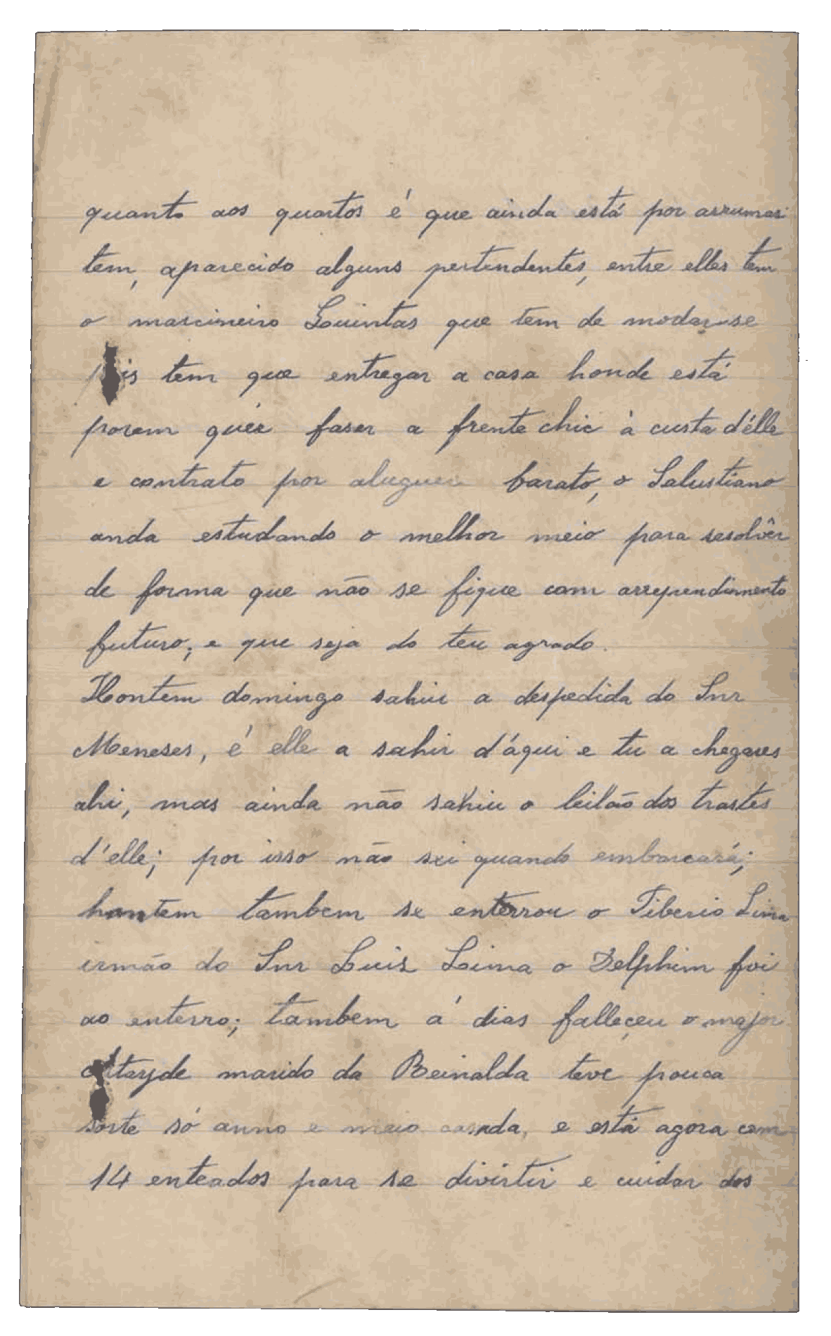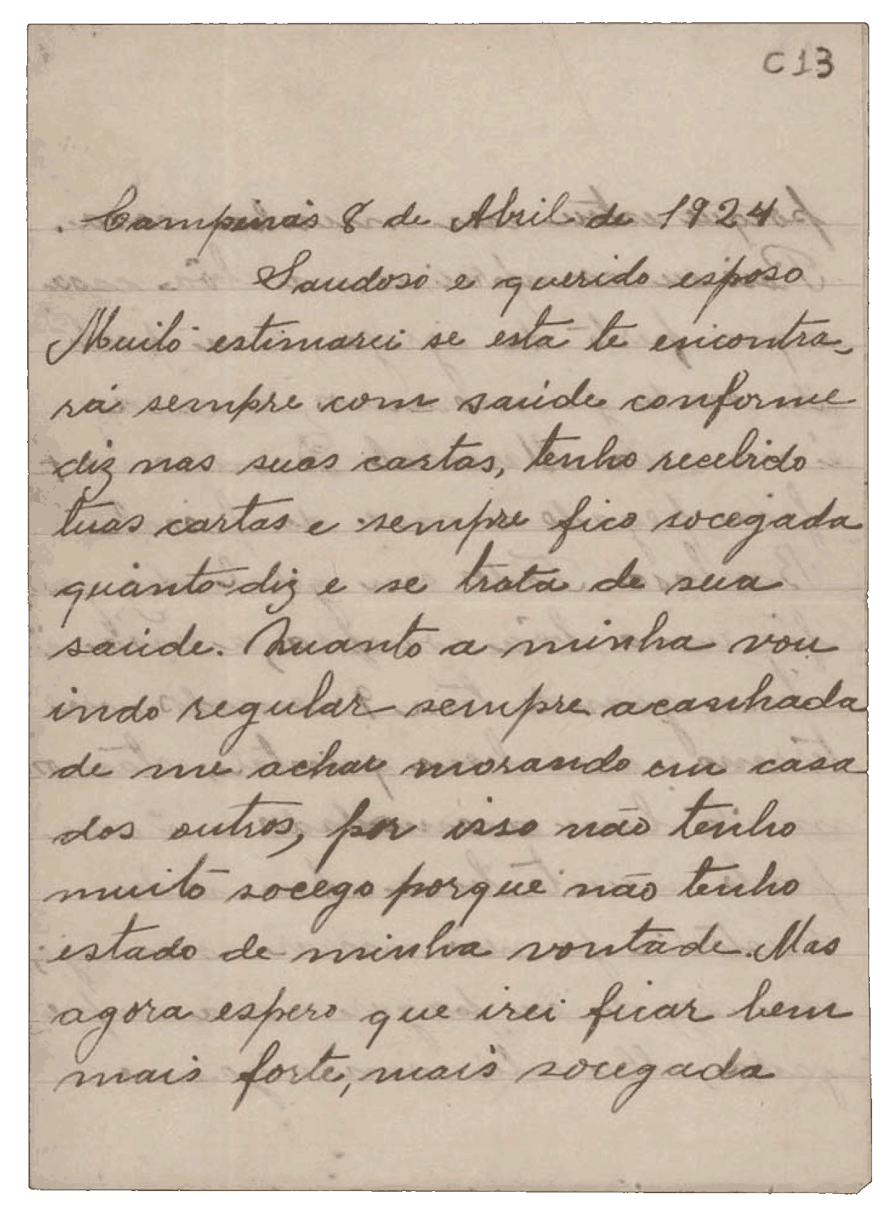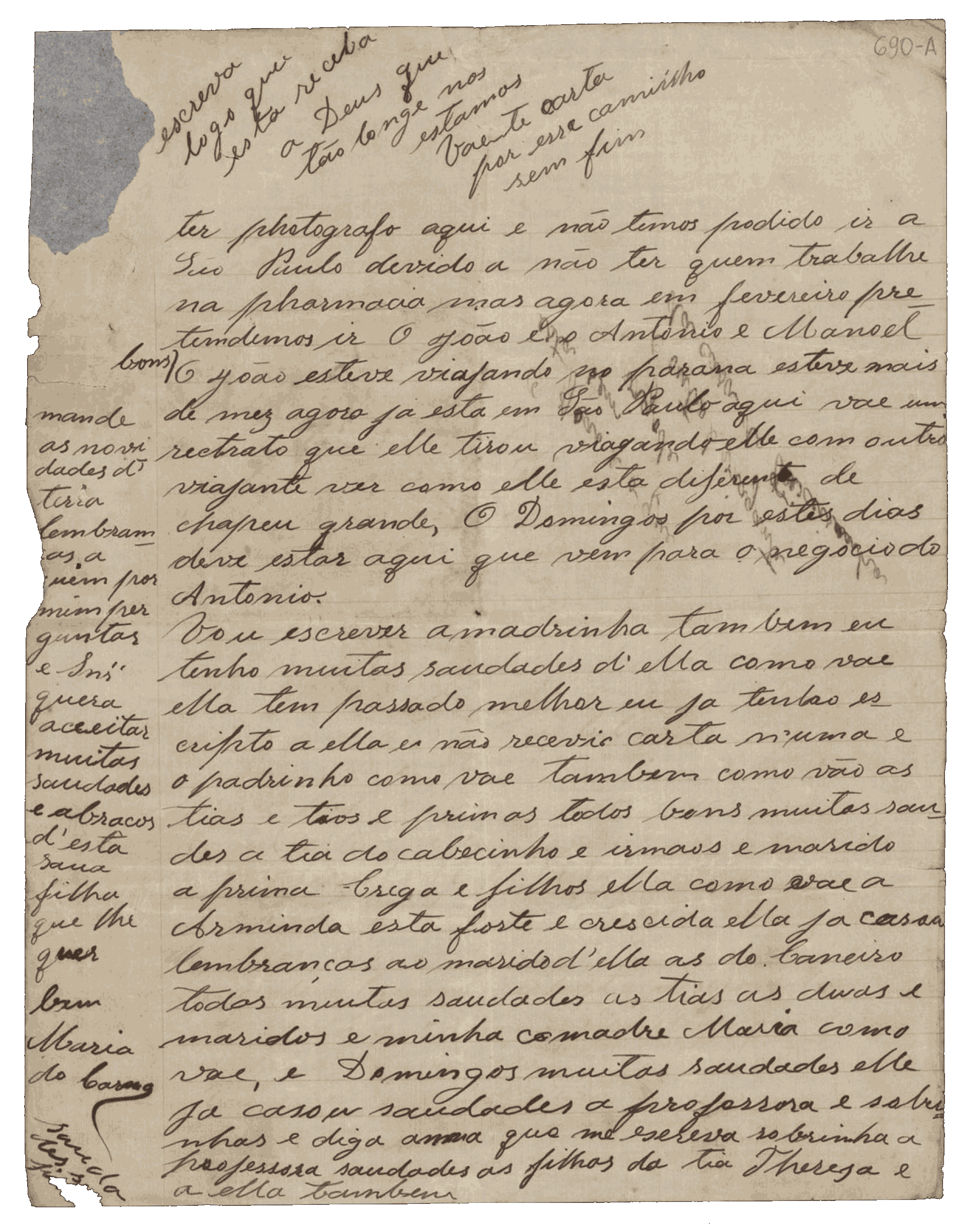 Aqui estou vivendo com os maiores amigos. Mesmo assim tenho que andar debaixo do pé deles, porque é triste quem aqui não tem ninguém. Custa-me muito aguentar a saudade da senhora, assim como a senhora deve sentir o mesmo por mim, porque é minha mãe. Se me tem alguma amizade, venha sem demora.