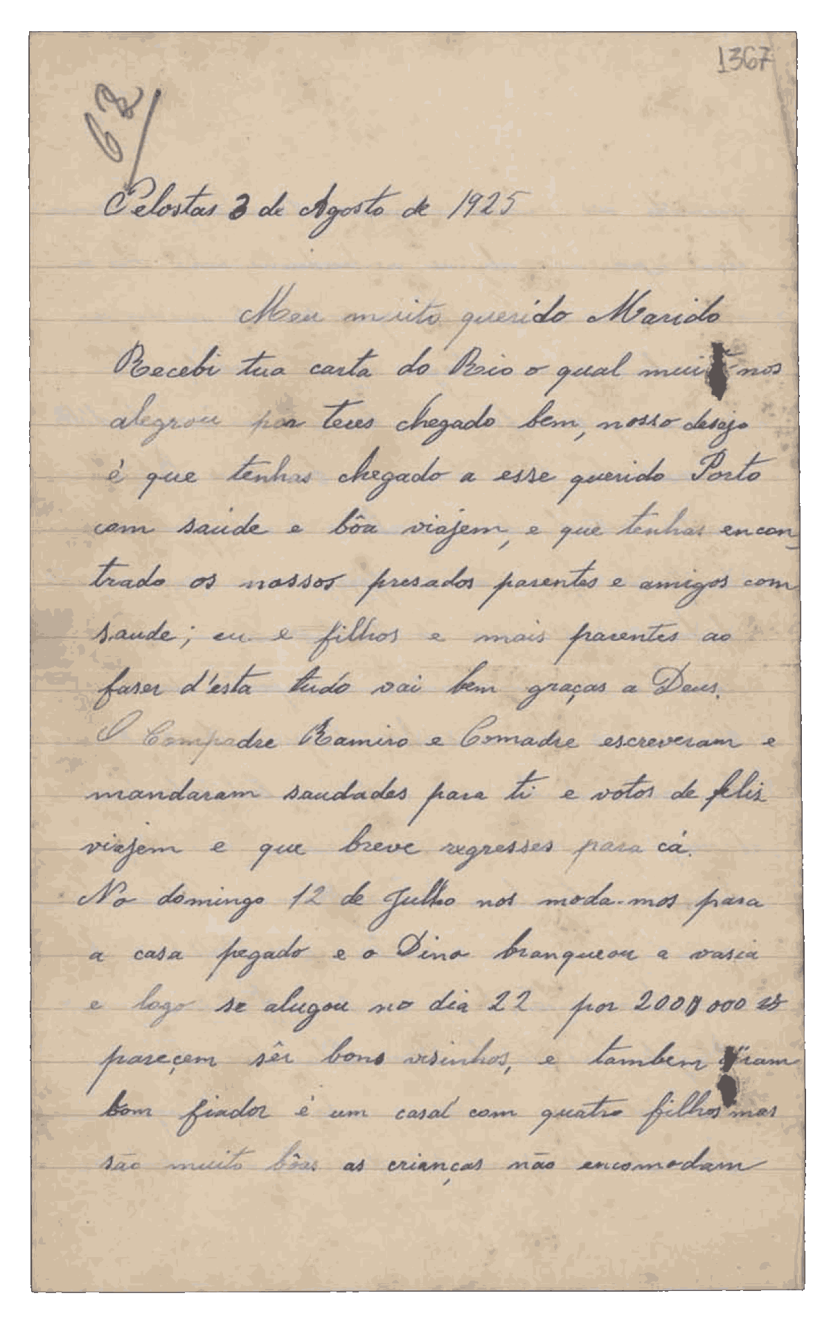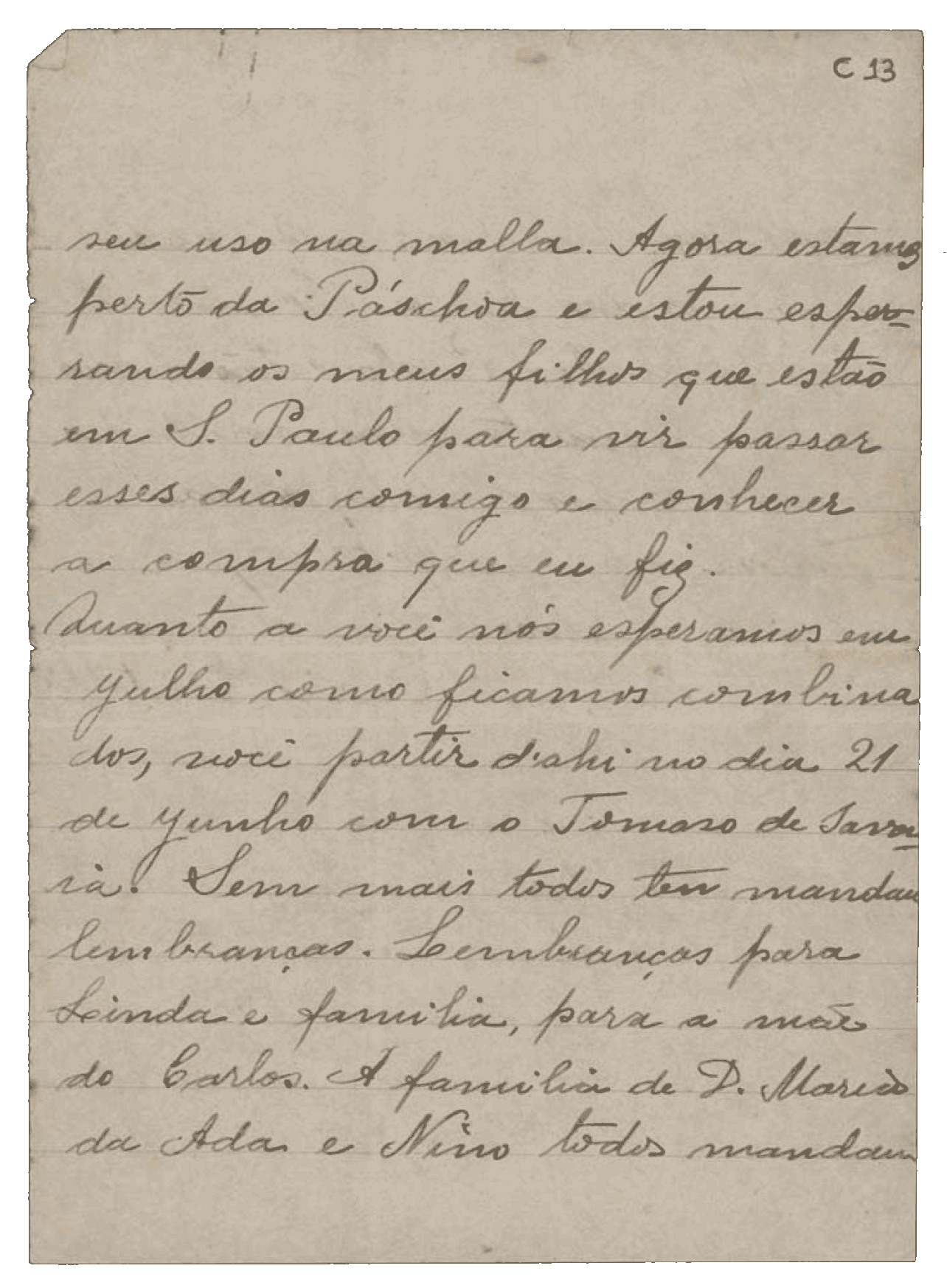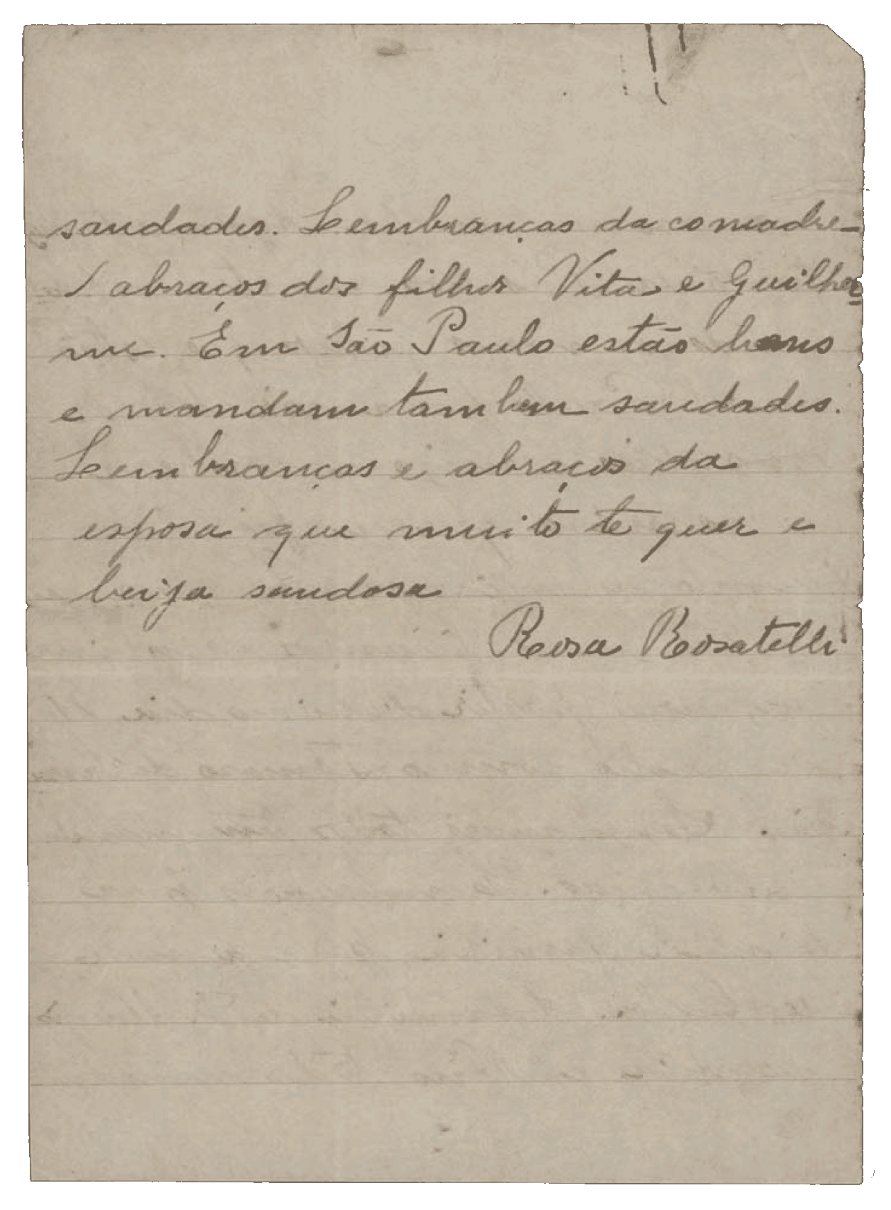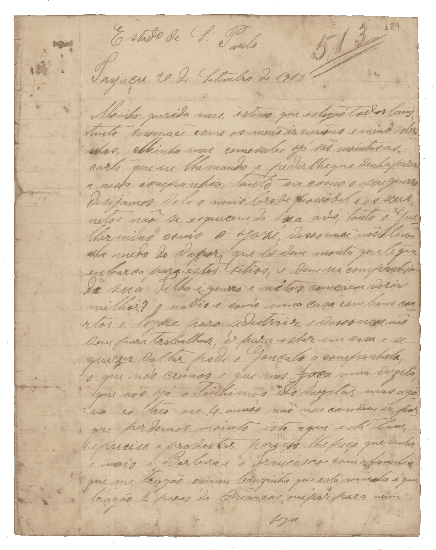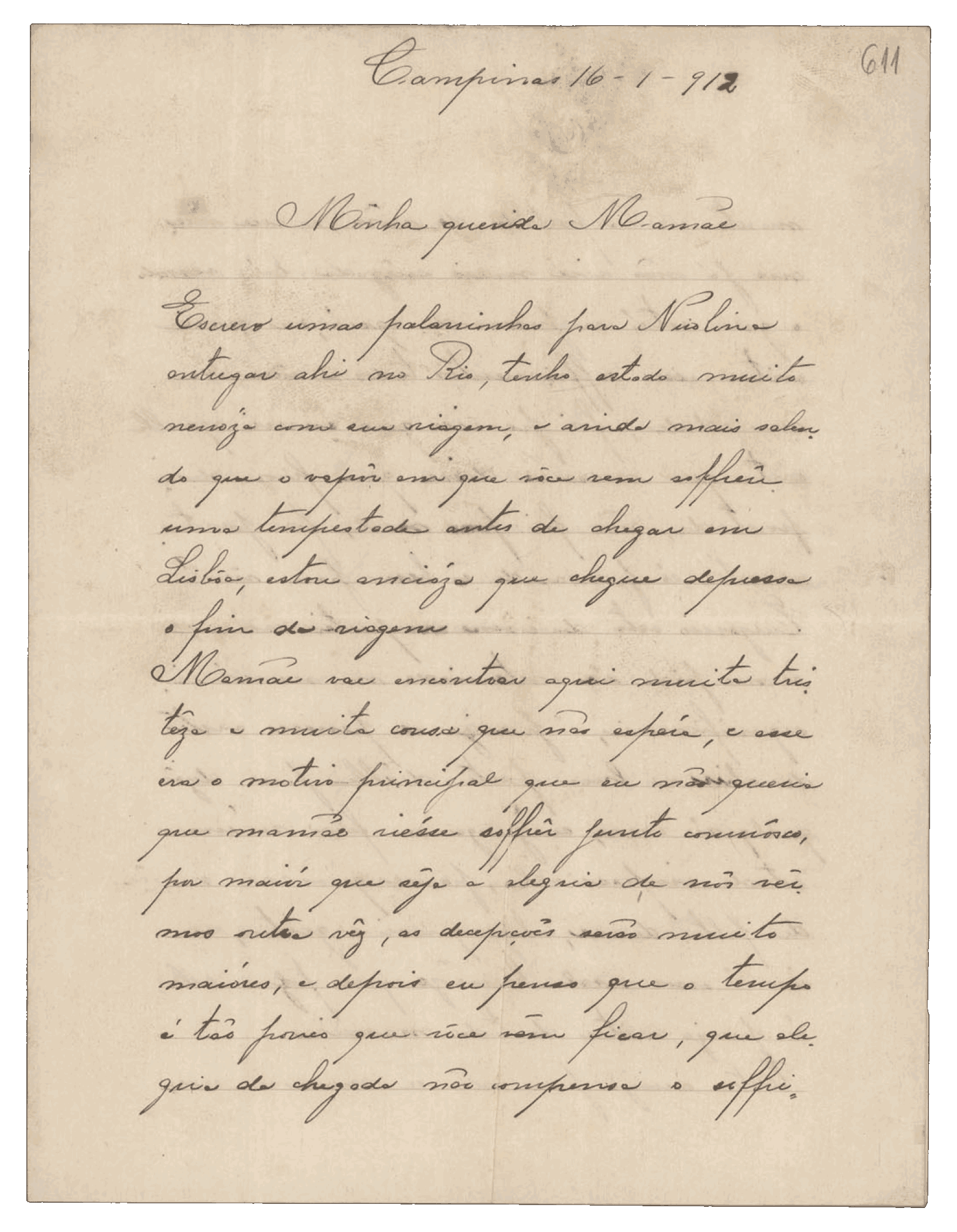 Minha querida mãe,Vossa mercê não tenha medo do vapor. O navio é como uma casa, com bons quartos e lugar para se distrair. Vossa mercê não vem para trabalhar, é para estar em casa. E, se quiser voltar, pode. Aqui estamos muito fartos: temos vacas, dois bois, porcos e bastantes galinhas e frangos, mais do que aí tínhamos.