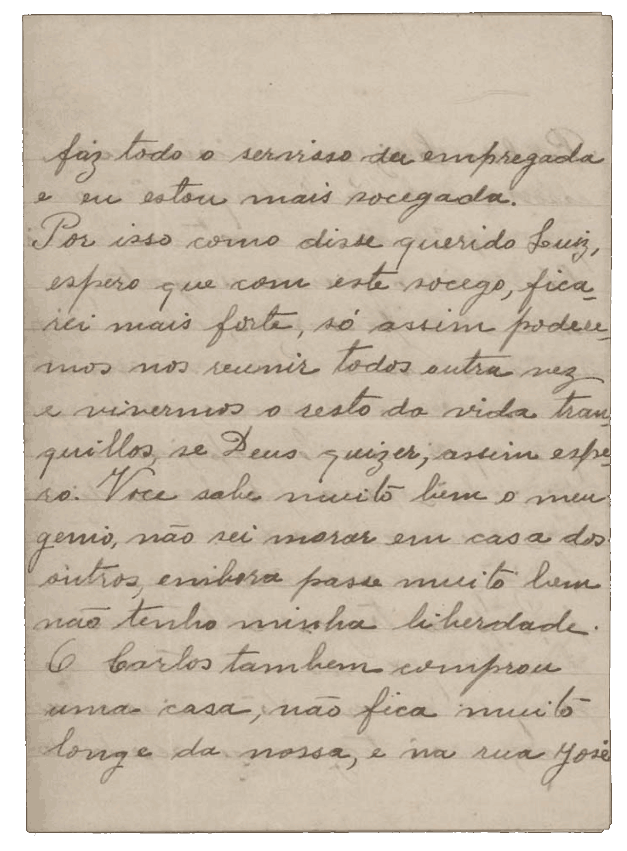 vou indo regular, sempre acanhada por ter estado morando em casa dos outros. Por isso não tinha muito sossego, porque não estava à minha vontade. Você sabe muito bem o meu gênio: não sei morar em casa dos outros. Embora passe bem, não tenho a minha liberdade.
